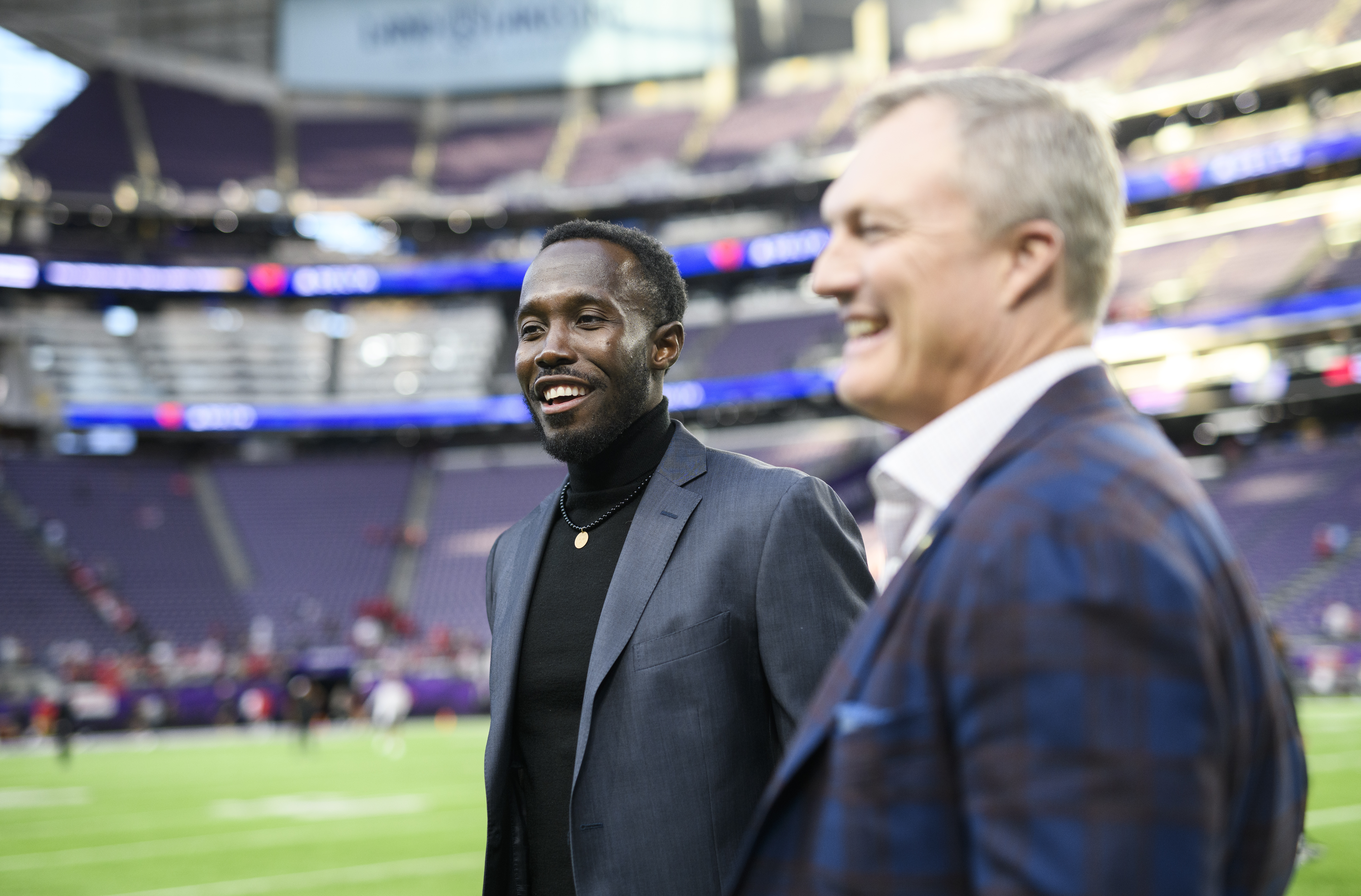 MINNEAPOLIS, MINNESOTA – OCTOBER 23: General manager John Lynch (R) of the San Francisco 49ers and general manager Kwesi Adofo-Mensah (L) of the Minnesota Vikings walk the field together before the game at U.S. Bank Stadium on October 23, 2023 in Minneapolis, Minnesota. (Photo by Stephen Maturen/Getty Images) | Getty Images