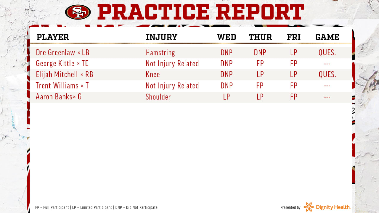 Dre Greenlaw and Elijah Mitchell are officially questionable for Sunday’s game Dre Greenlaw and Elijah Mitchell are officially questionable for Sunday’s game Insidethe492023-10-13T17:00:29-04:00October 13th, 2023 at 5:00 PM|News| Read More