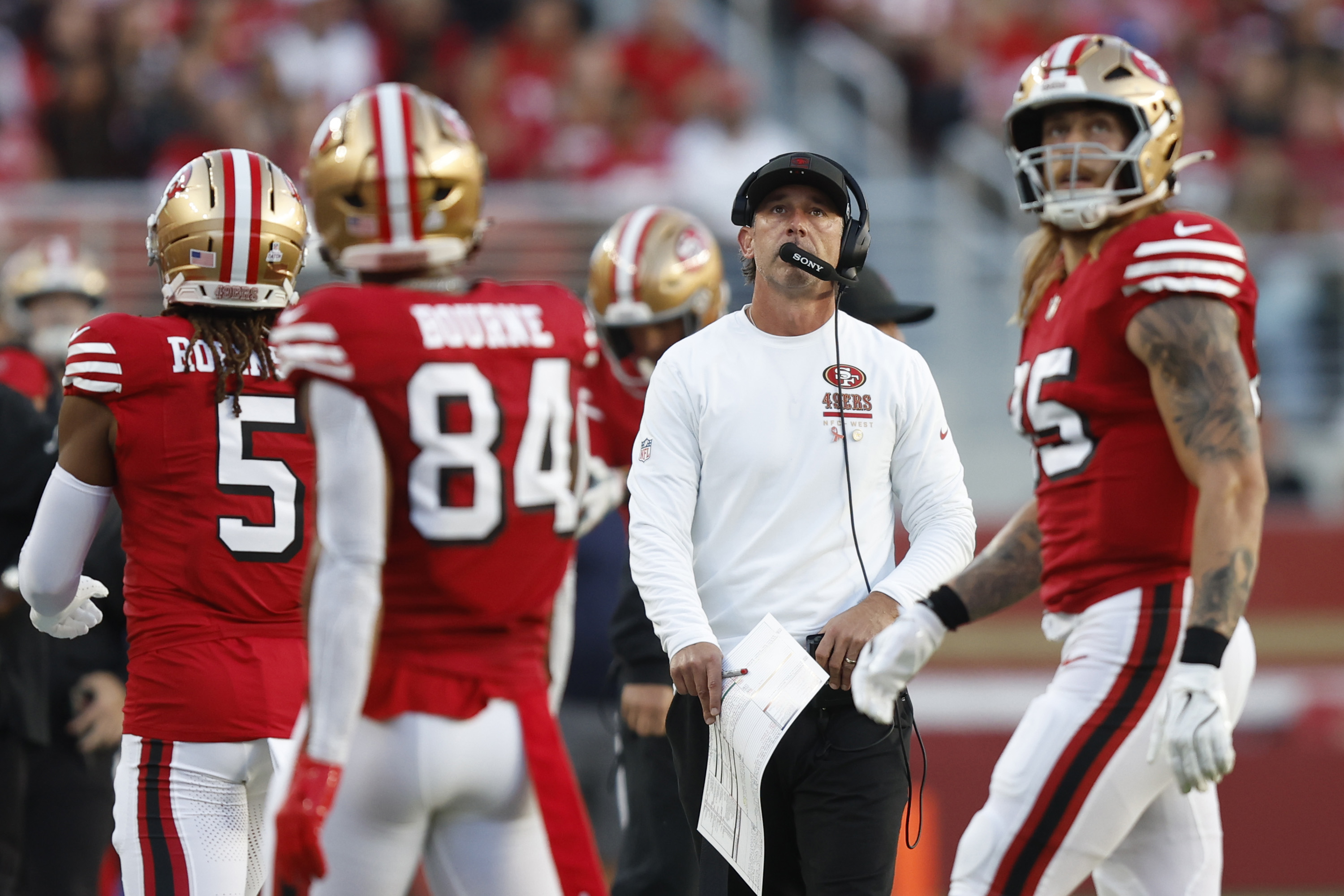 “They are 5-2 and tied for the division lead. The defense came up big against the Falcons without stars Nick Bosa and Fred Warner, who are gone for the year.”