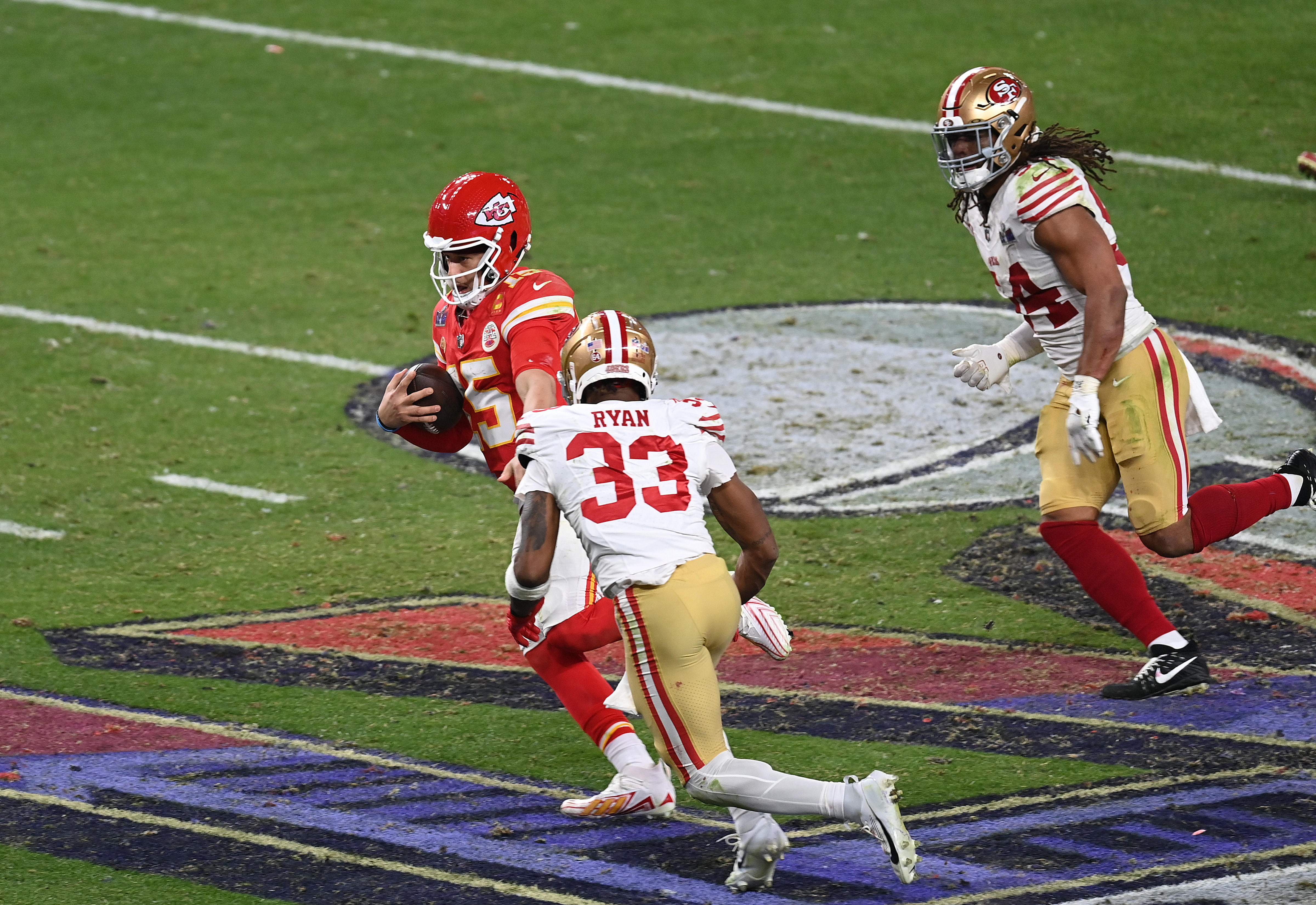 LAS VEGAS, NEVADA – FEBRUARY 11: Patrick Mahomes #15 of the Kansas City Chiefs scrambling with the ball is pursued by Logan Ryan #33 and Fred Warner #54 of the San Francisco 49ers in overtime during Super Bowl LVIII at Allegiant Stadium on February 11, 2024 in Las Vegas, Nevada. (Photo by Focus on Sport/Getty Images) | Getty Images