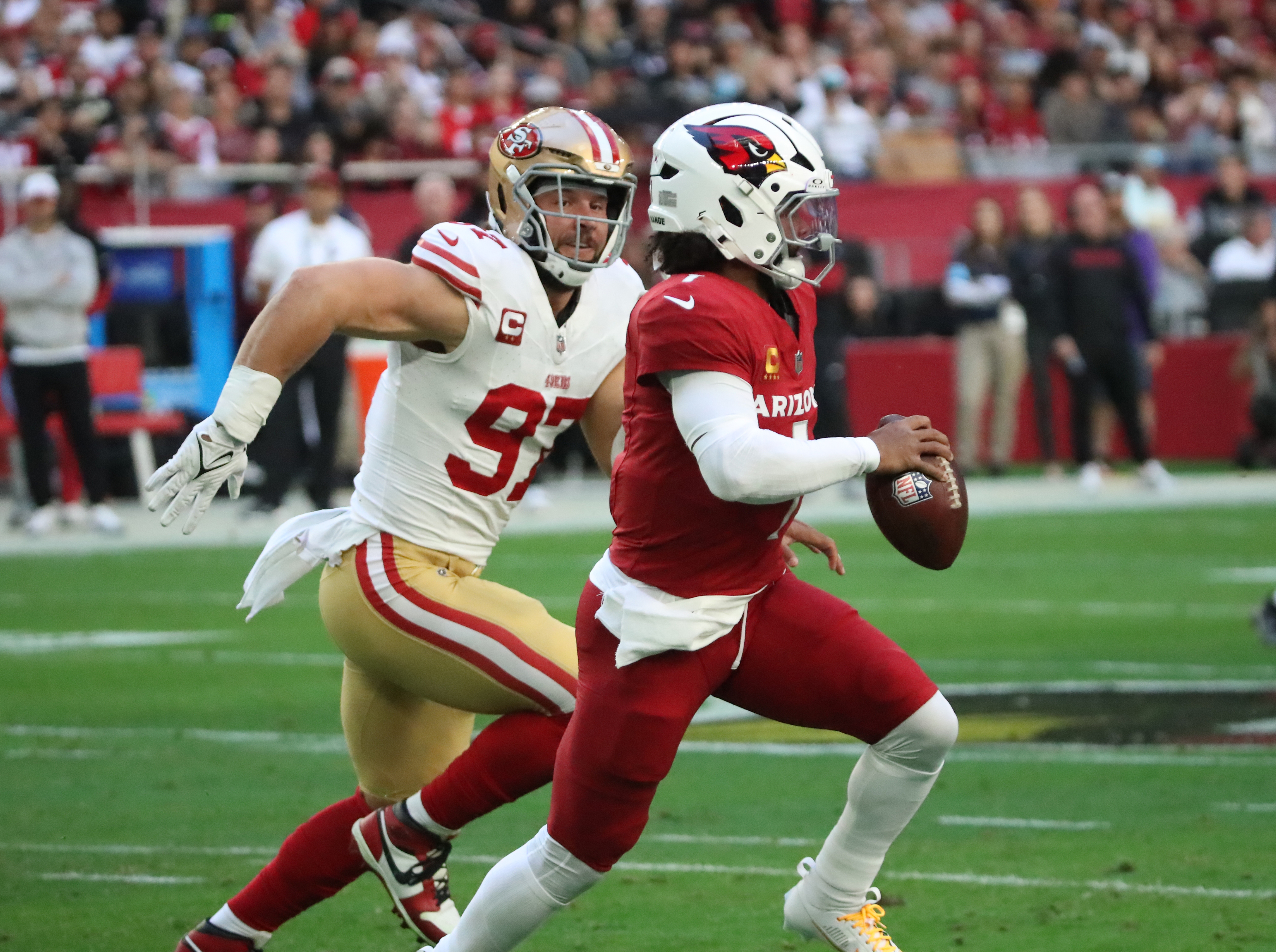 “Murray kept the ball on a read-option, found an opening where then-49ers linebacker DeVondre Campbell should have been. Murray made a 50-yard sprint to the end zone, as safety Talanoa Hufanga charged toward the line of scrimmage and lost sight of the fleet quarterback.
