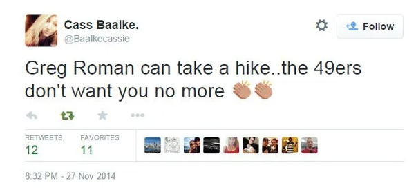 Despite Harbaugh’s backing, Roman continued falling out of favor with the fans and the general manager’s daughter. I’m not kidding, then-GM Trent Baalke’s daughter Cass posted this following a brutal Thanksgiving loss to the Seahawks.